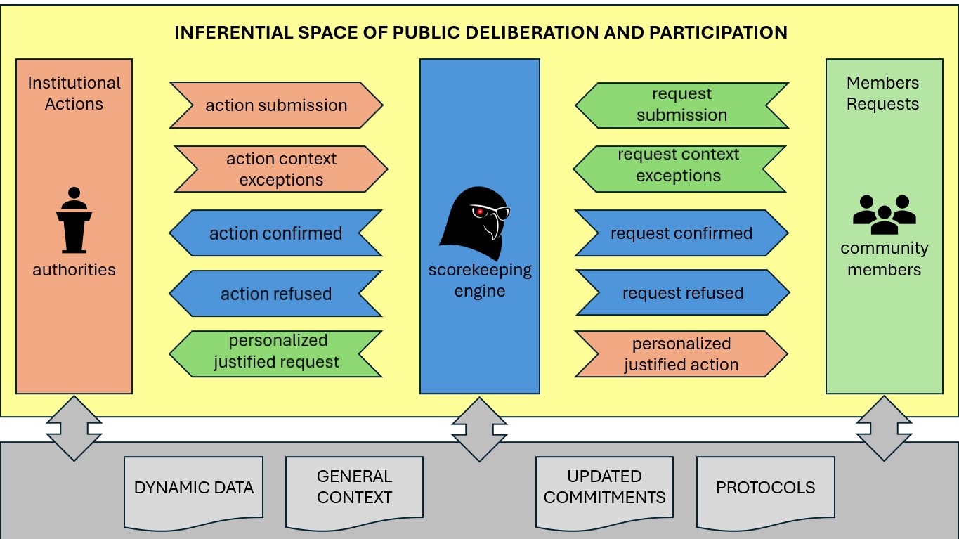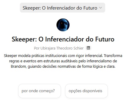 A validação dessa hipótese apoia-se na ampliação do Skeeper — assistente conversacional baseado em inteligência artificial, já desenvolvido em nível prototípico. Essa ampliação será fundamentada em um modelo conceitual de mediação inferencial, estruturado a partir do método de scorekeeping de Robert Brandom, com o objetivo de tornar explicitáveis e auditáveis as relações entre ações, exceções contextuais e compromissos institucionais.